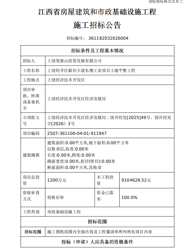 上饒經(jīng)開區(qū)新科大道東側(cè)工業(yè)項(xiàng)目土地平整工程施工招標(biāo)公告
